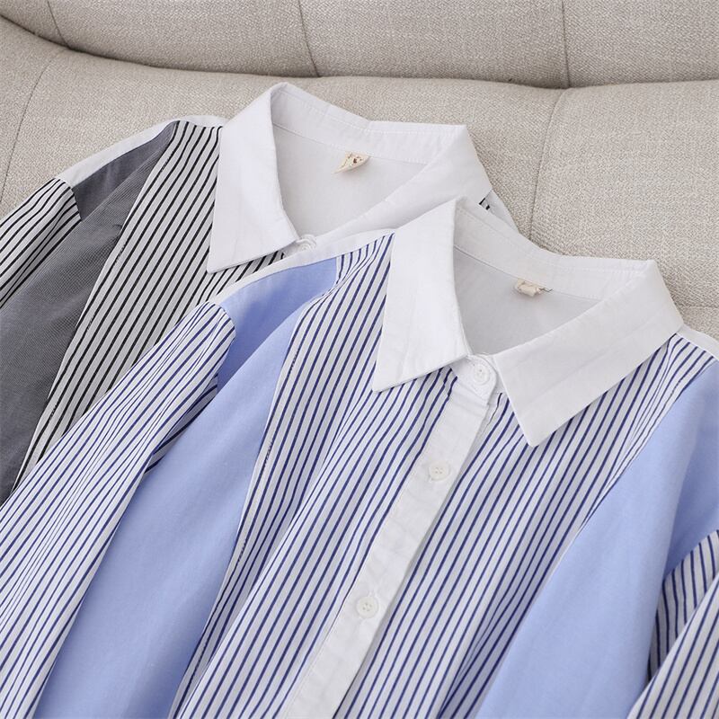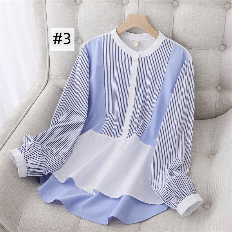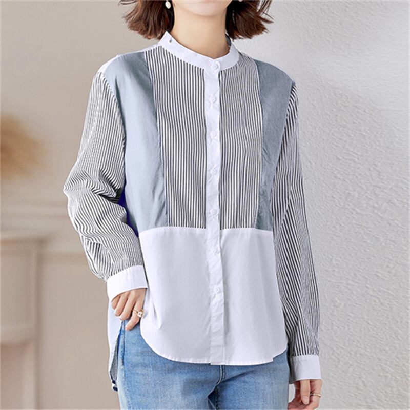 wcs-600V-ネック & スタンドカラー ストライプ柄 シャツ トップス長袖 ブラウスカットソ