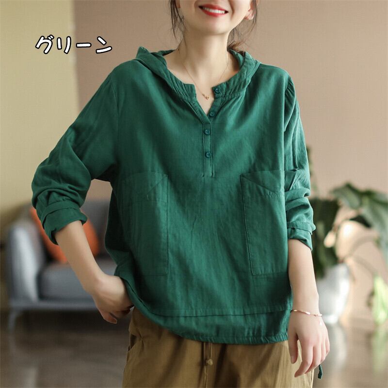 ny-108フード付きプルオーバーパーカートップス リネン混 綿