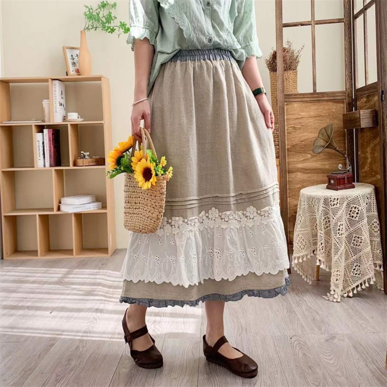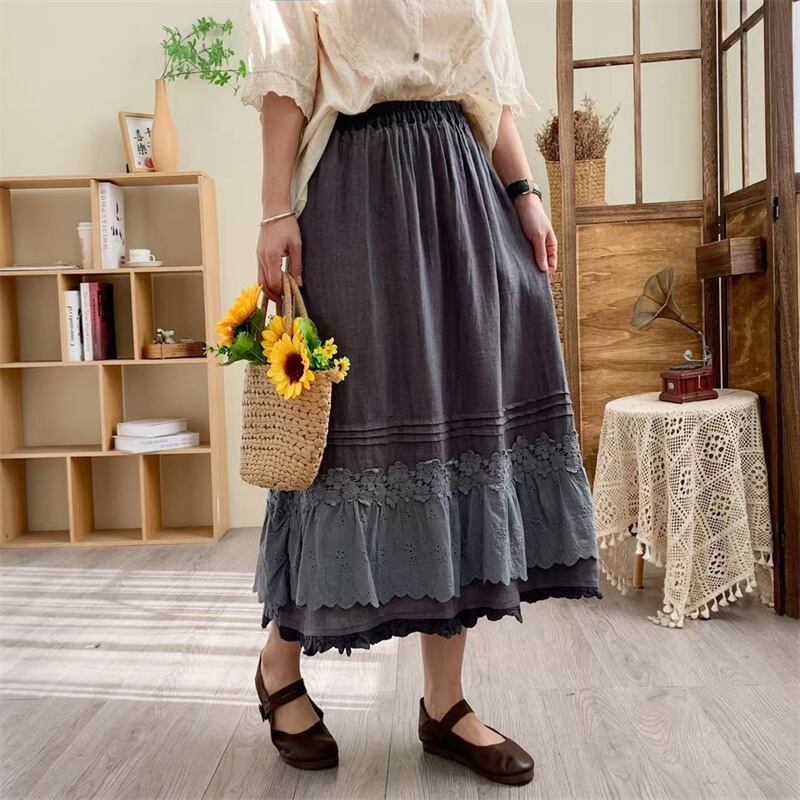 wq-382レース裾プリーツリネン混綿 スカート