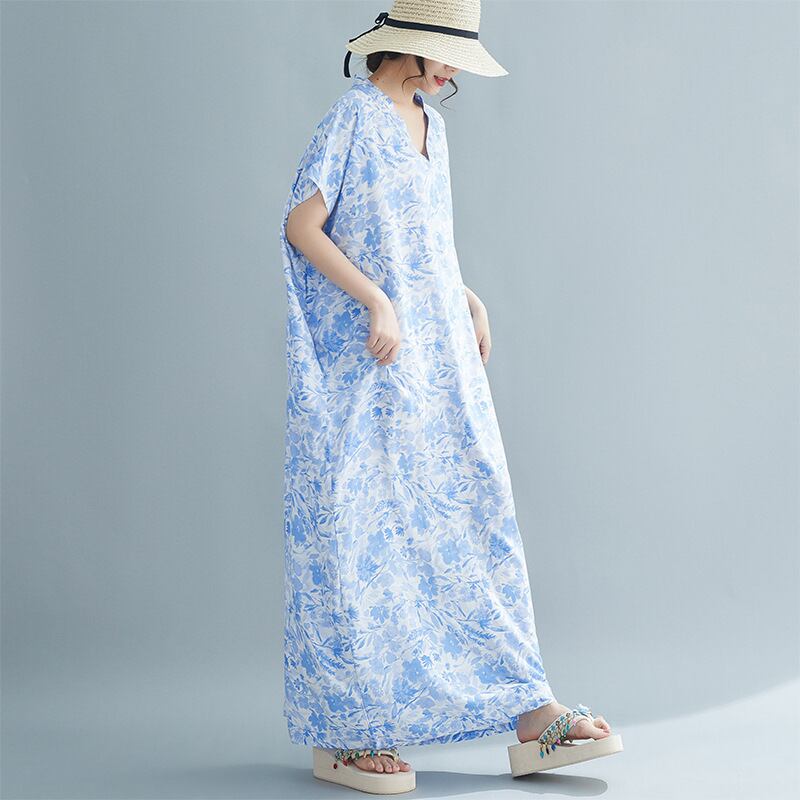 nl-921 V-ネック ワンピース 花柄 ワンピース 体型カバー 半袖 ロング丈 大きいサイズ