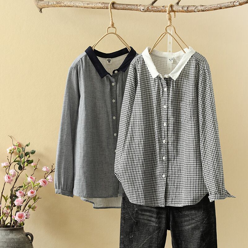 wcs-912 丸襟ナチュラル系ダブルガーゼシャツ・ブラウス チェック柄 綿 長袖