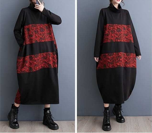 nl-1248 ハイネック花柄切り替えデザインロングワンピースゆる 体型カバー新作