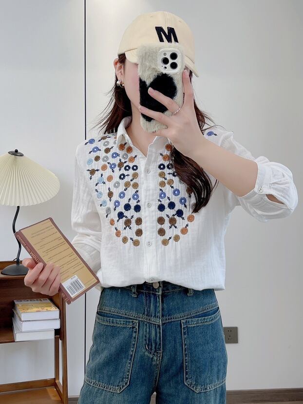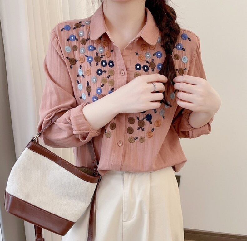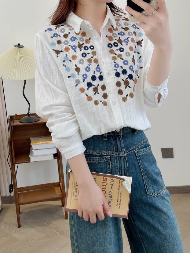 wcs-1079長袖/ナチュラル系ダブルガーゼカラーコットンシャツ・ブラウス【2024春新作】