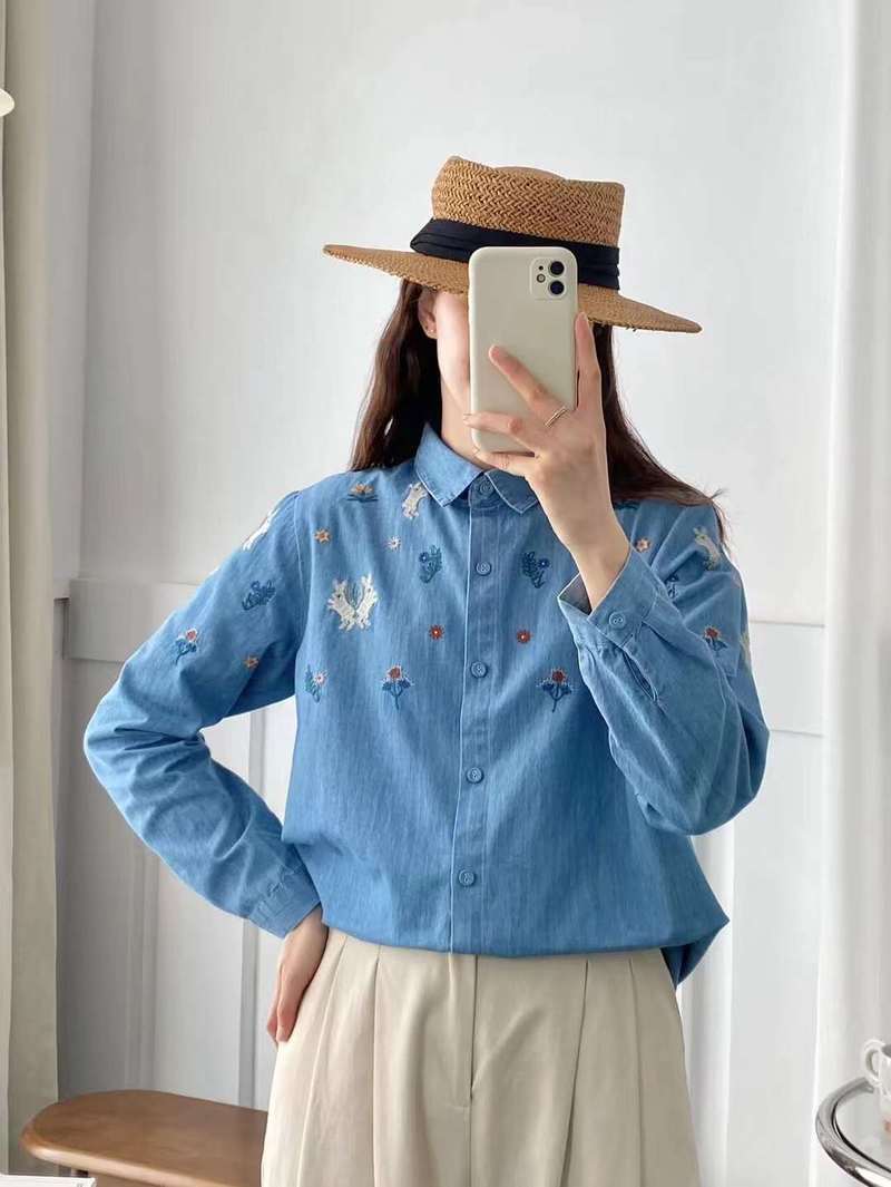wcs-1151 デニム刺繍切り替えデザイン長袖トップスストライプシャツ・ブラウス【2024春新作】