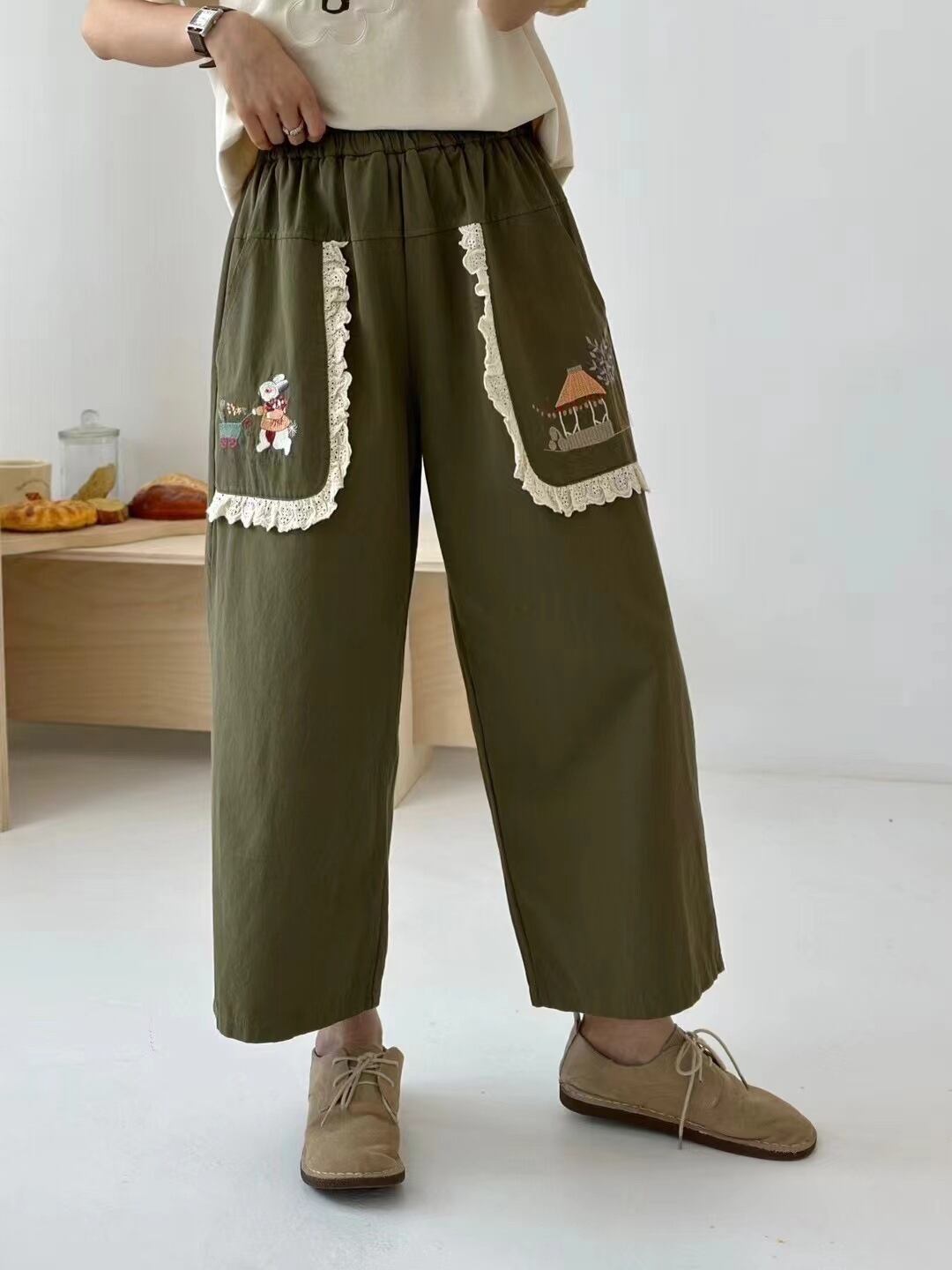 wk-768 刺繍デザイン兎柄 ワイドパンツジーパン 弾性ウエスト【2024春新作】