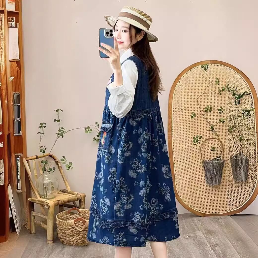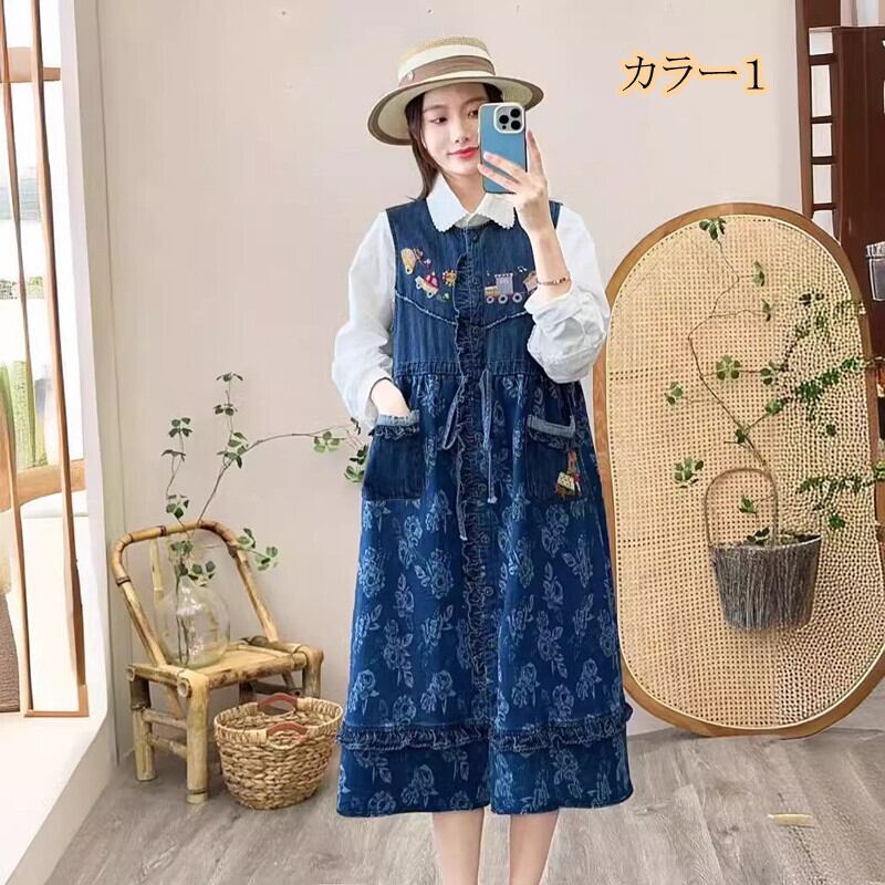 nl-1398 刺繡花柄デザインロングデニムワンピース【2024春夏新作】