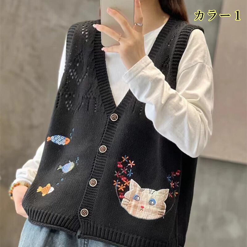 wb-335 猫柄デザイン ニットベストトップス【2024秋新作】